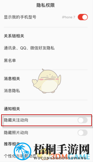 3、滚动至页面底部,将“隐藏关注动向”功能开启。