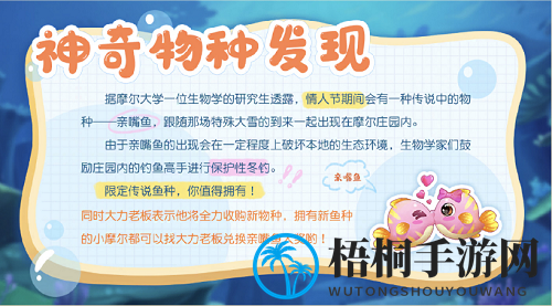 4、亲嘴鱼是情人节限定传说鱼,仅在活动期间现身,夜晚则不见踪影,玩家们要留意时间哦。