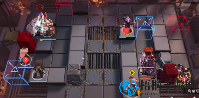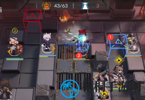 开局将先锋置于左上角,2号位狙击向上射击,快速复活干员击毁柱子后撤退。
