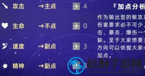 3、在加点上,建议主攻攻击,副系则选择速度和精神,10点加点可分配为4点攻击、3点速度和3点精神;