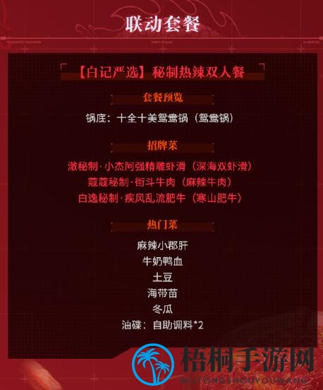 联动套餐:在【无期迷途X小龙坎联动主题店】的大众点评/美团页面购买【白记严选】秘制热辣双人餐,即可尊享局长专属优惠套餐