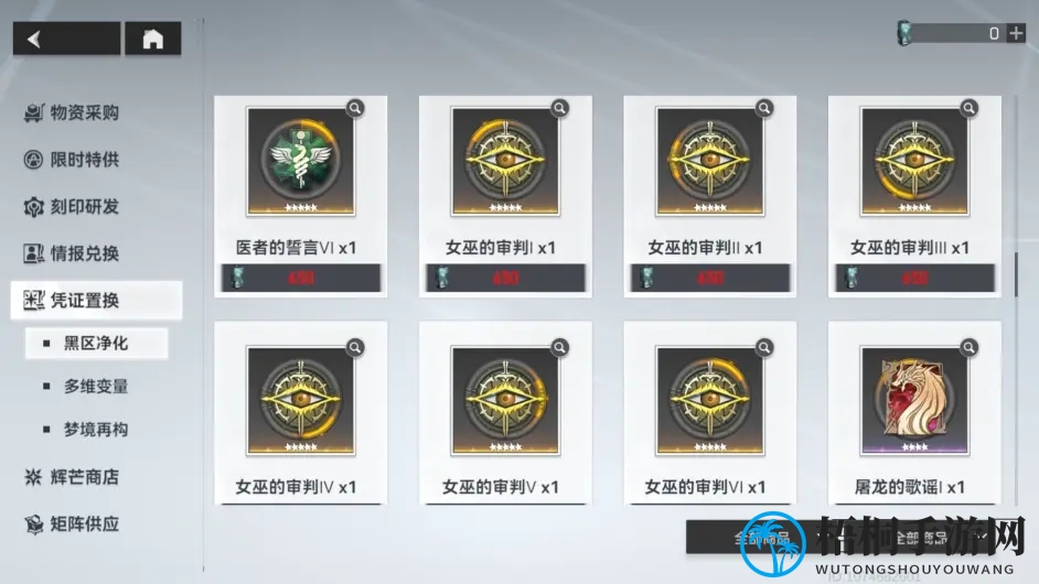 积累足够的「黑耀沉淀」后,玩家可前往「商店」→「交易区」→「黑耀沉淀」→「凭证置换」→「黑区净化」,挑选「女巫的审判」「屠龙的歌谣」「剑客的守则」「医者的誓言」「阳炎的圣甲虫」等刻印商品。