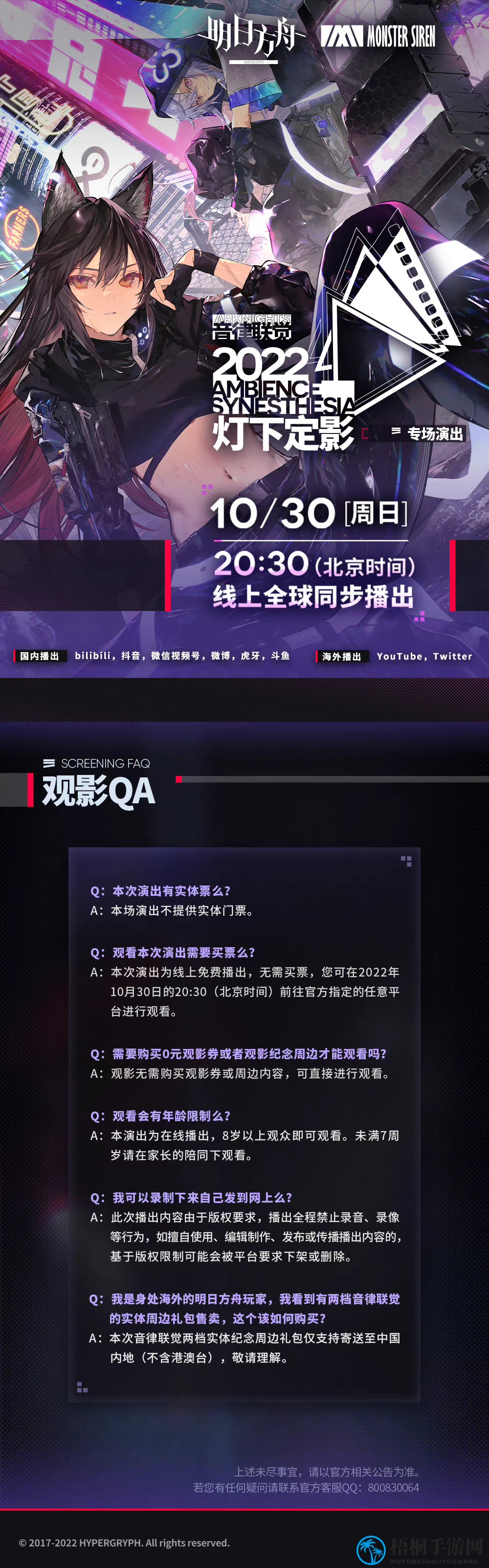 亲爱的明日方舟粉丝,备受瞩目的音律联觉2022「灯下定影」演出时间终于揭晓,你是否已经准备好迎接这场视听盛宴的线上直播了呢?下面,让我们一起揭晓这场音乐盛宴的具体演出时刻!