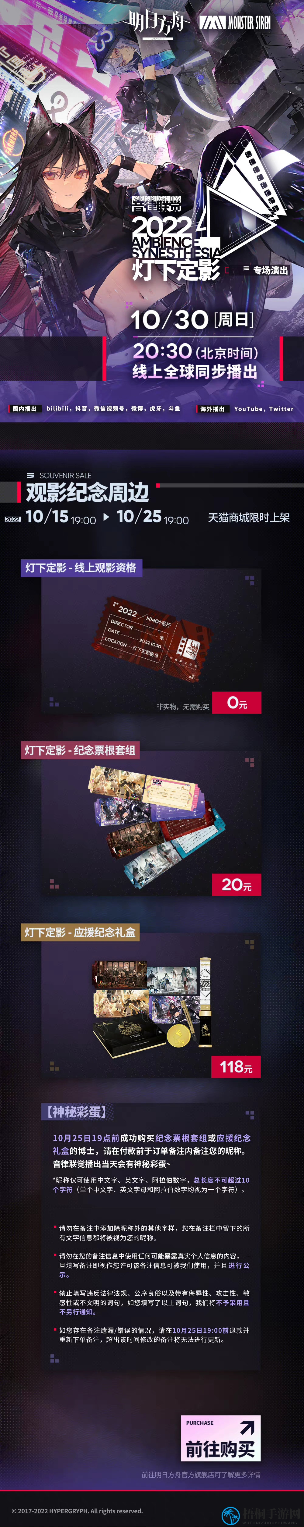 ※ 10月25日19点前成功购买纪念票根套组或应援纪念礼盒的玩家,请在订单备注中留下您的昵称。音律联觉播出当天将揭晓神秘彩蛋,敬请关注@明日方舟朝陇山获取更多详情。
