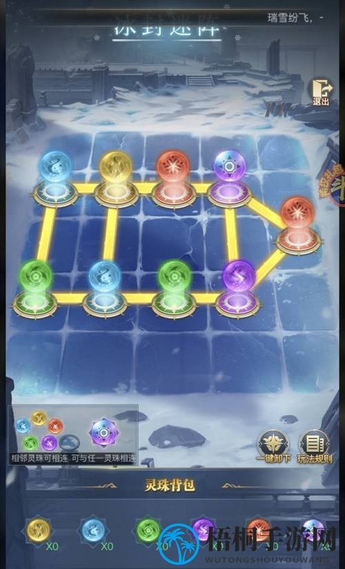 3、点击未布置灵珠的冰盘,可从下方选择灵珠进行放置。点击冰盘上的已安装灵珠,可执行卸下操作。依据灵珠既定连接规则布局灵珠,点亮冰盘间的通道,确保迷阵中的每条线路都保持点亮连通,即算通关成功。