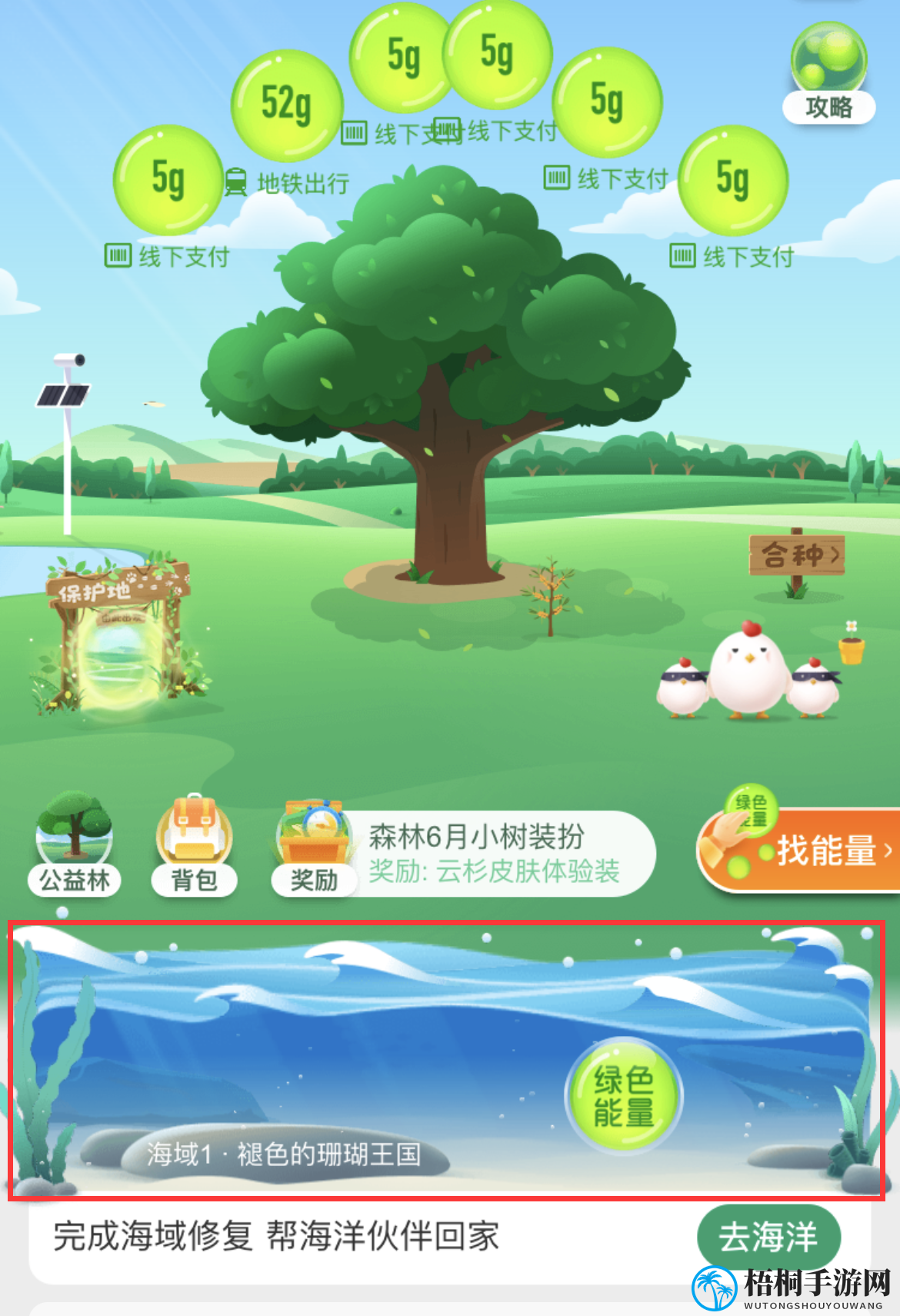 2、踏入蚂蚁森林,点击下方的水池图标即可进入“神奇海洋”