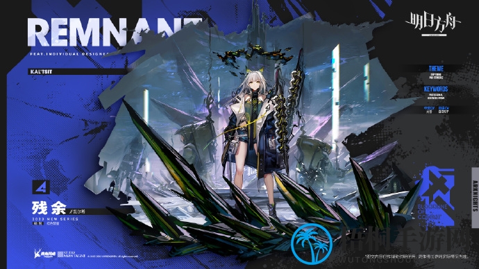新皮肤“残余”系列,背景设定中,源石力量已将大地同化,宇宙力量化为现实。凯尔希肩负使命,化身为锋利之刃,独自承担一切。